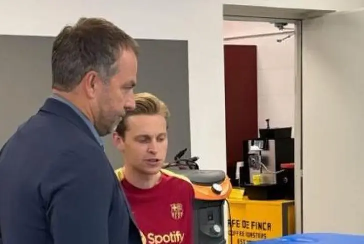 Recorriendo las instalaciones del FC Barcelona, donde trabajará durante las dos próximas temporadas al menos, Hansi Flick se encontró con uno de los jugadores de la plantilla blaugrana y que tendrá a su cargo en los próximos meses. El alemán vio a Frenkie De Jong, quien está en el club continuando su recuperación de cara a la Eurocopa 2024 con Países Bajos. El neerlandés sufrió un esguince en su tobillo derecho en el último partido ante el Real Madrid el pasado 21 de abril y le ha costado estar fuera del campo por el último mes de competencia.