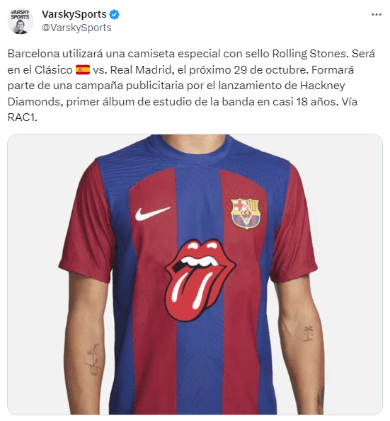La banda de rock británica The Rolling Stones será la elegida para mostrar su lengua rockera en la camiseta blaugrana en El Clásico, además teniendo en cuenta que no pudo elegir un mejor momento para mostrarse por cuenta del nuevo álbum de la agrupación, uno de los mas esperados de este siglo XXI, tras mas de 18 años sin producciones y teniendo como ultimo antecedente un disco del año 2005.