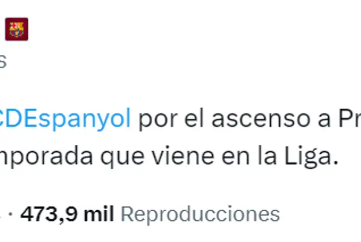 El ascenso del Espanyol significa que volverá a jugar el clásico catalán junto al FC Barcelona, que tanto ha dado de qué hablar a lo largo de la historia del fútbol español. Como es habitual en la cuenta oficial del equipo culé, envía felicitaciones a los rivales que consiguen logros como el que tuvo hoy el Espanyol o también sucedió con el Real Madrid cuando obtuvo La Liga.