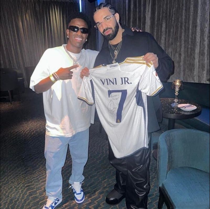 Hay muchos musicos que siguen mucho el fútbol internacional o que siguen los deportes en general. Drake, el cantante canadiénse que hace rap, es uno de ellos. Esta vez estuvo con Vinicius en los Estados Unidos y se juntaron para tomarse unas fotografías y charlar un rato. De paso, el nuevo 7 del Madrid le obsequió una camiseta firmada por él.