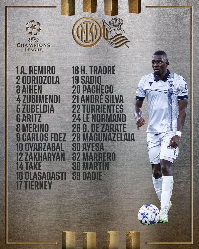 Pasando al dilema y el compromiso de mañana donde la Real Sociedad llega con la primera chance de cerrar con broche de oro en su grupo, ya que, a pesar del empate en puntos con el Inter, tiene mejor diferencia de gol, el equipo de Imanol Alguacil formaría con el siguiente once: Remiro; Traoré, Zubeldia, Le Normand, Aihen; Zubimendi, Merino; Kubo, Zakharyan, Oyarzabal; Sadiq.