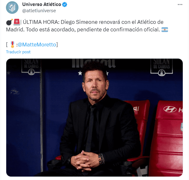 En los últimos días se había conocido la intención de Enrique Cerezo por lograr reunirse con Diego Pablo Simeone, a fin de buscar concretar la renovación del entrenador hasta la temporada 2026 o 2027, las conversaciones iniciaron en el pasado parón de selecciones por la fecha FIFA del mes de septiembre, y una fuente muy cercana al club, el periodista Mateo Moretto del diario Relevo habría confirmado el hecho, reseñando que el anuncio se haría en los próximos días. Recordemos que el contrato del Cholo tiene fecha de vigencia hasta el 30 de junio del 2024.