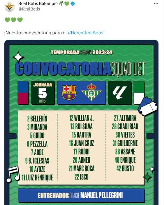 El equipo de Manuel Pellegrini se ubica en la casilla 8 con 7 unidades y sabe que la solidez defensiva será clave en condición de visitante, donde deberá trabajar en aspectos puntuales ante un equipo que tiene un ataque cada vez mas cohesionado ante las ausencias ofensivas de Robert Lewandowski pero grandes apariciones como las de Yamal y Gavi. Uno de sus estandartes aun no tiene el alta para retomar competencia y por ende la preocupación del entrenador crece.
