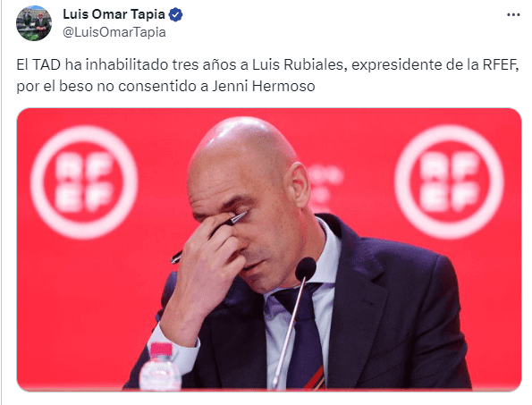 Tres años de sanción fue la medida impuesta por el máximo organismo del fútbol mundial, ante lo que rubiales respondió: “Tras mi rápida suspensión de la FIFA y el resto de los casos en mi contra, es claro que no puedo regresar a mi puesto”, quien también dejó la vicepresidencia de la UEFA, además de su cargo en el fútbol español. Recordemos que mientras las investigaciones corren, el dirigente está inhabilitado para ejercer cualquier cargo alrededor del fútbol por los próximos tres años, e incluso puede ser mayor la extensión.