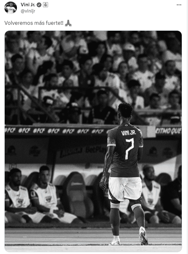 “Creo que es la misma lesión que la última vez. Recibí un golpe ahí y me resentí un poco más tarde. Mañana haremos pruebas para ver cómo voy”, mencionó Vinícius en el post partido. Ya en la noche de hoy ha dejado un mensaje acompañado de mucha emotividad a todos sus seguidores y los millones de fans del madridismo, quienes le han enviado su apoyo y solidaridad en las últimas horas: "volveré más fuerte", reseñó el atacante sudamericano de 23 años.