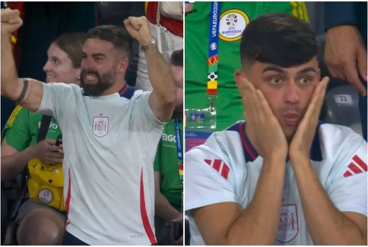 Pedri y Dani Carvajal, uno lesionado y el otro sancionado, vieron el partido desde las gradas del estadio del Bayern Múnich. Ambos observaron en primera plana el gol de Lamine Yamal y no podían creer el remate que desenfundó el 19 de la Roja. El mediocentro del Barça puso una cara de total sorpresa, mientras que el lateral del Real Madrid lo festejó con los brazos en altos y con un gran grito.